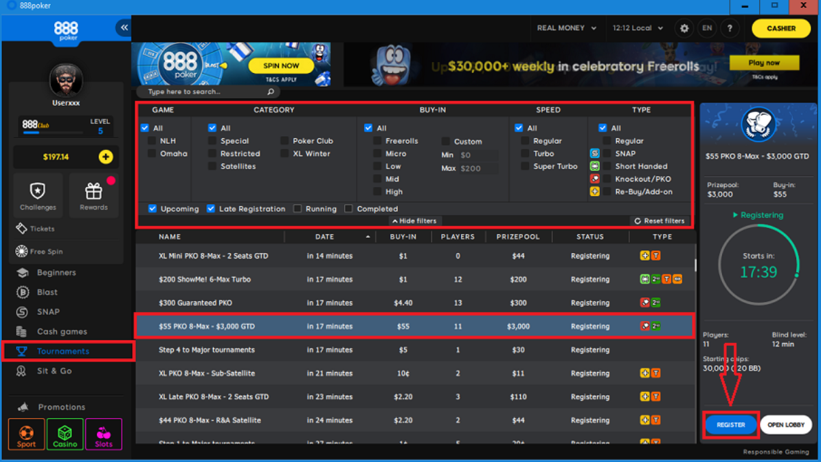 - Select the type of: GAME, CATEGORY, BUY-IN, SPEED or TYPE (Top menu)