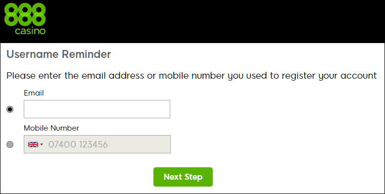 2. Enter the email address or mobile number used to register your 888casino account; click 'Next Step'.