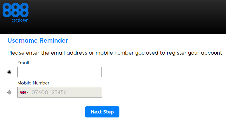 2. Enter the email address or mobile number used to register your 888poker account; click 'Next Step'.